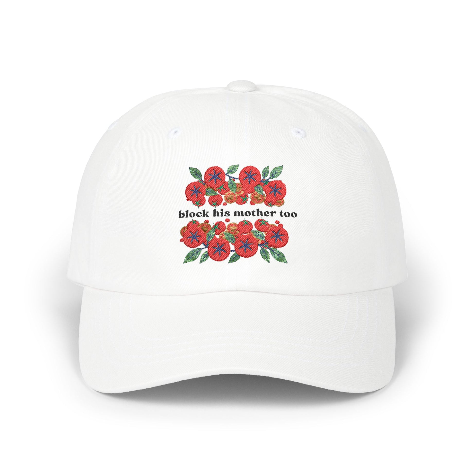 This six-panel cotton twill hat features our signature tomato vine frame roaring in vibrant red and green, with cheeky “block his mother too” lettering nestled right between.