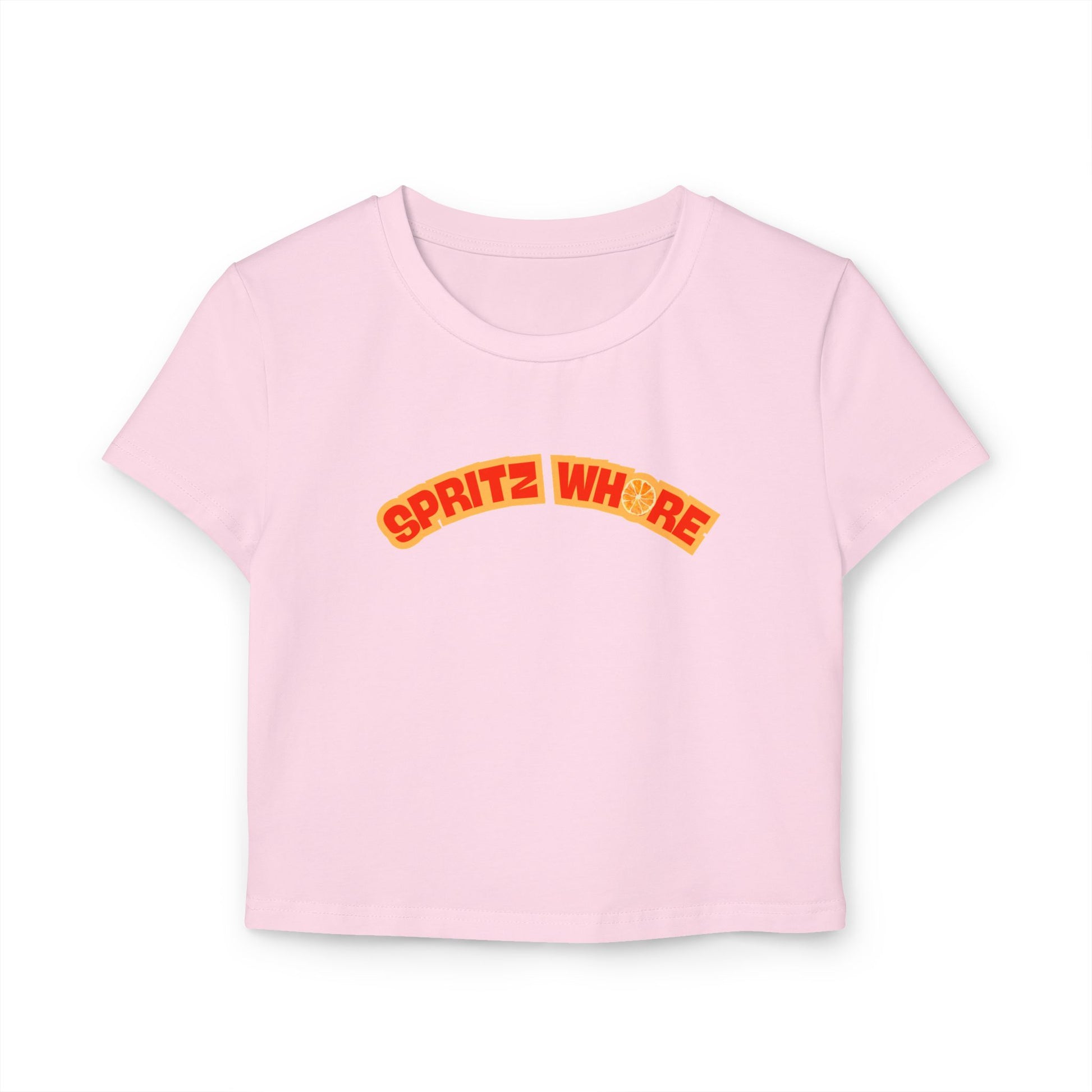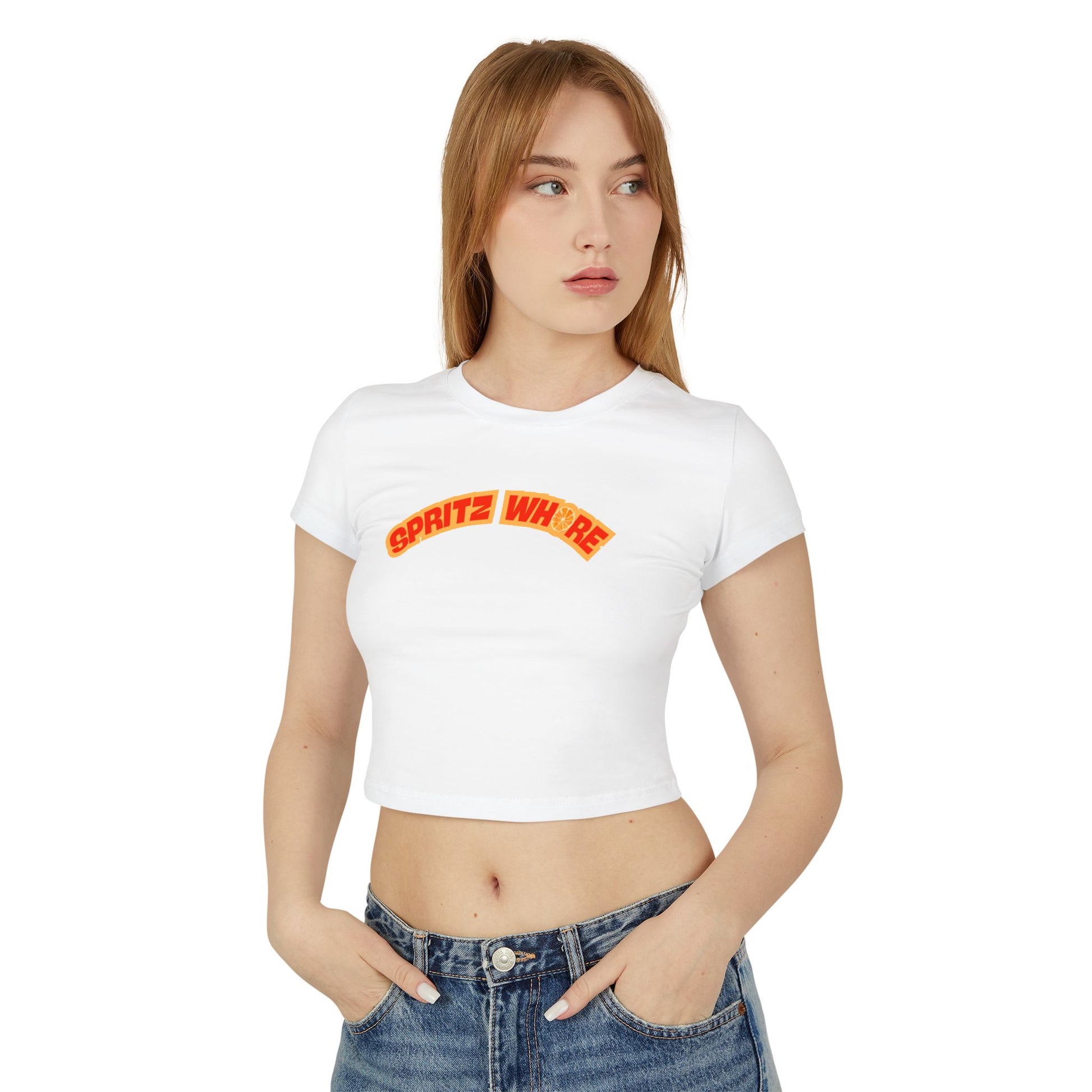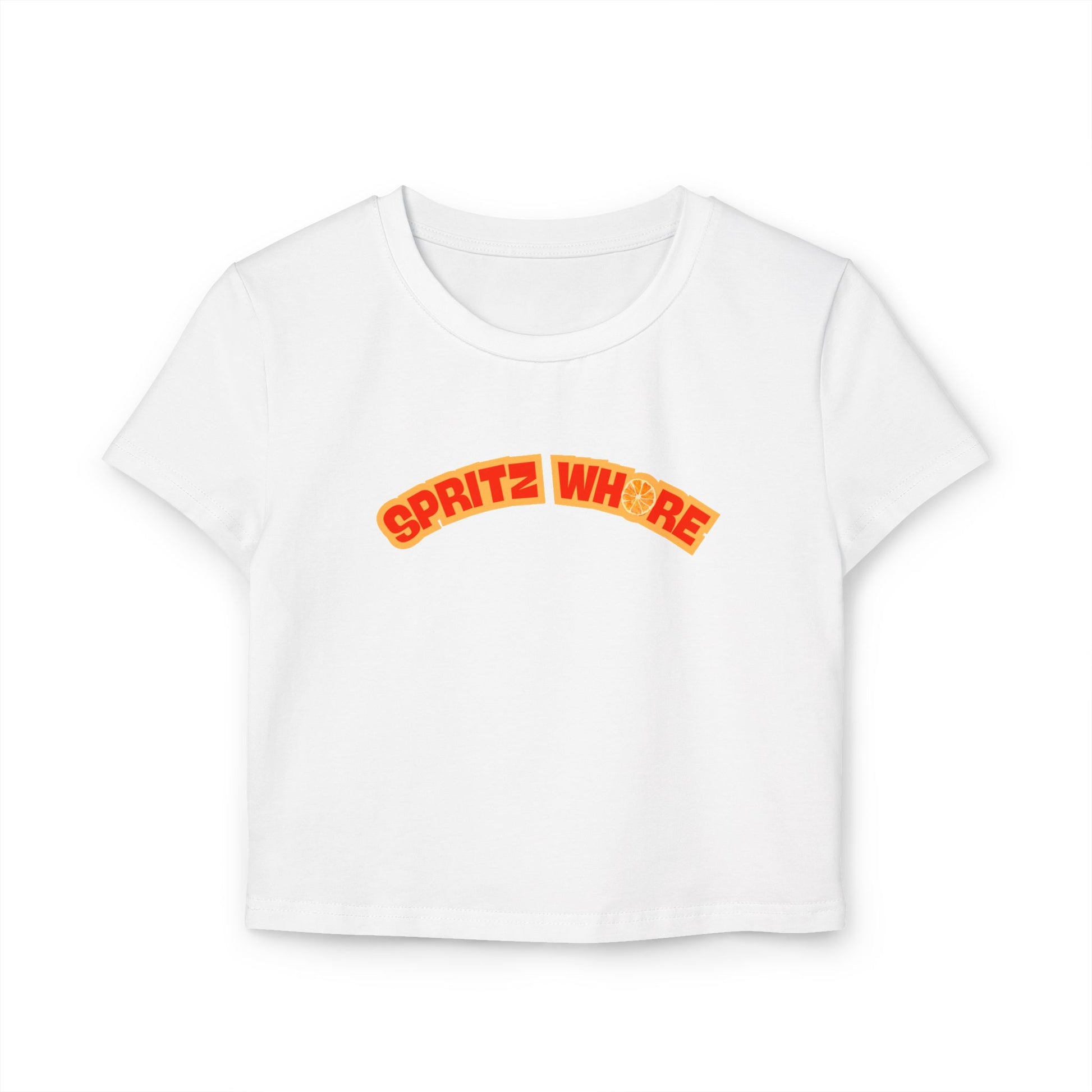 The SPRITZ WHORE crop top is a high-fashion wink to Italian indulgence and unapologetic femininity. With vintage-inspired arch lettering in vibrant citrus tones, this piece pairs playful rebellion with elevated simplicity — a statement for those who savor every moment (and every sip).